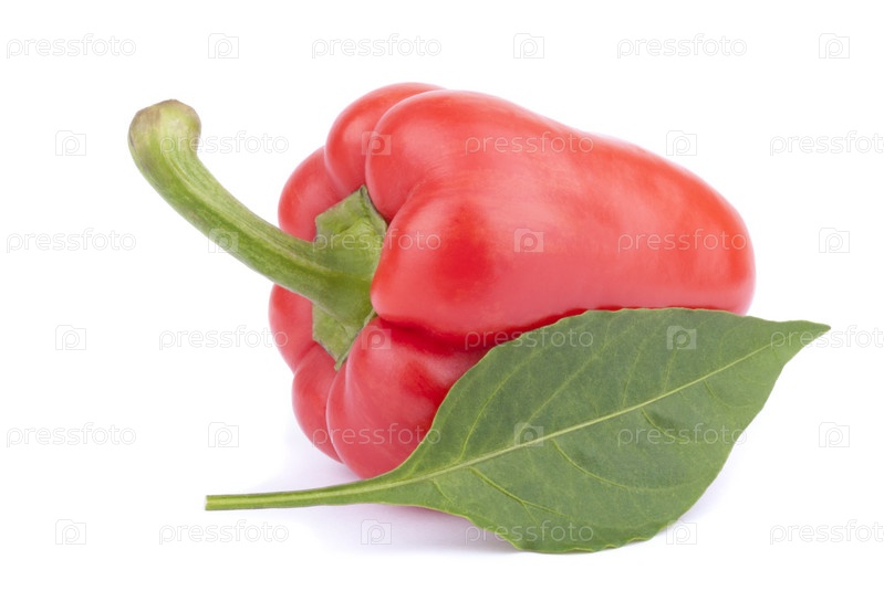 Красный сладкий перец с листком на белом фоне