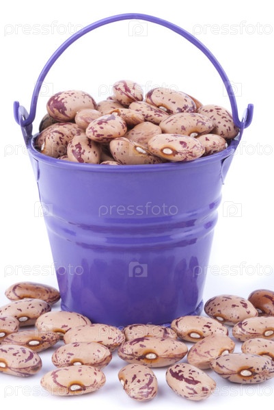 Железное ведро с фасолью на белом фоне