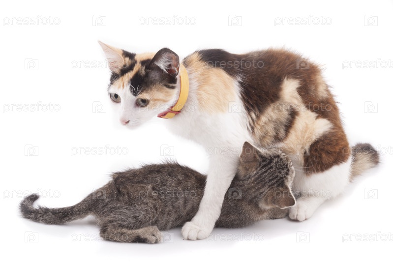 Кошка кормит котенка
