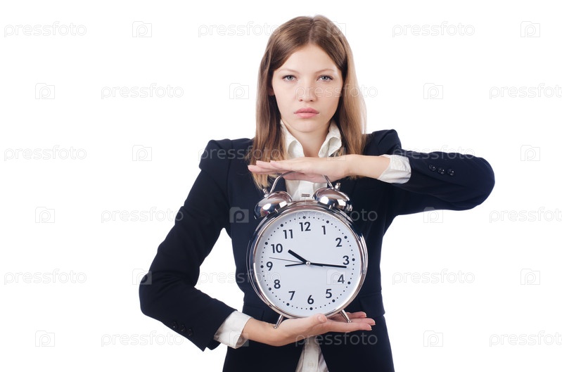 Бизнес-леди с часами, изолированная на белом фоне