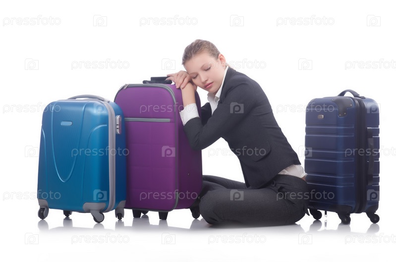 Бизнес-леди путешествует, изолировано на белом фоне