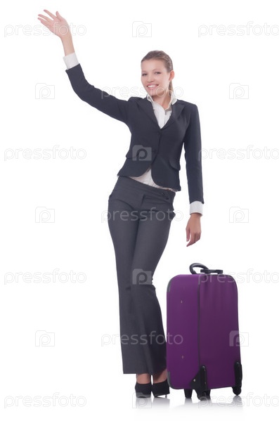 Бизнес-леди путешествует, изолировано на белом фоне