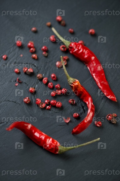 Специи: красный перец на черном деревянном фоне
