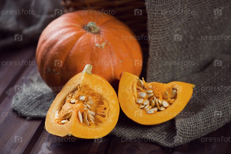 Спелая тыква и ломтики на мешковине