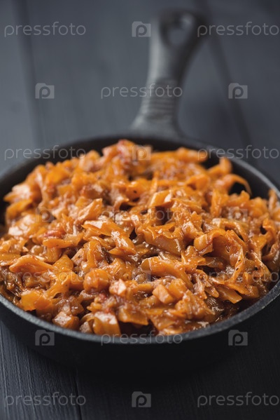 Тушеная капуста в сковороде, черный деревянный фон