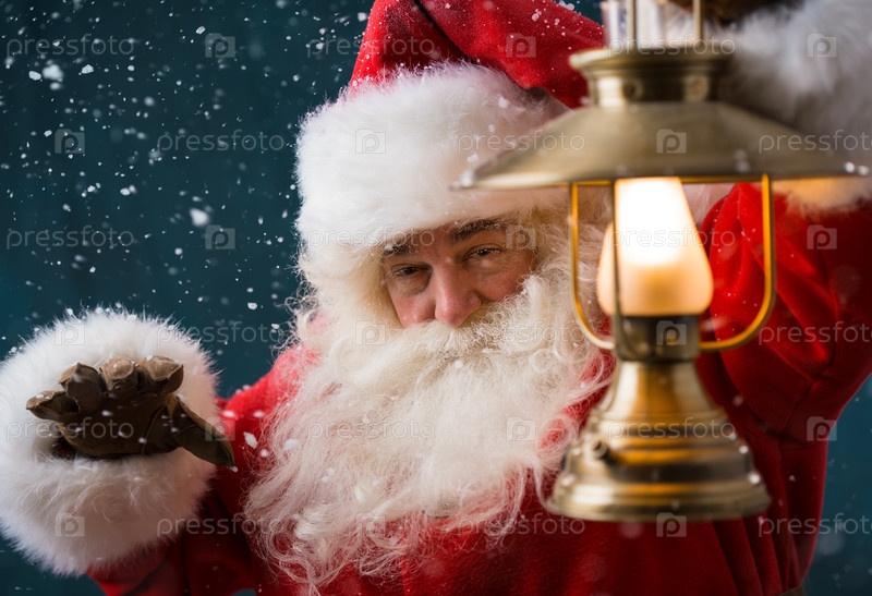 Санта-Клаус держит фонарь на улице ночью