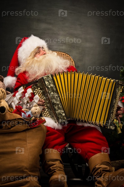 Санта-Клаус с аккордеоном сидит в кресле возле рождественской елки