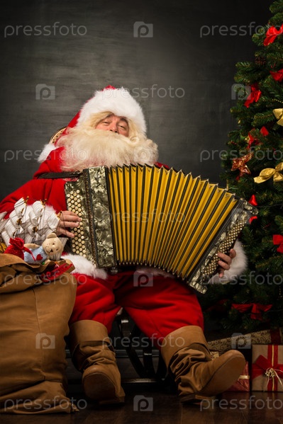 Санта-Клаус с аккордеоном сидит в кресле возле рождественской елки