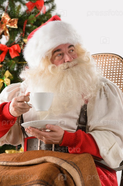 Санта-Клаус сидит в кресле-качалке возле рождественской елки и пьет горячий чай или кофе