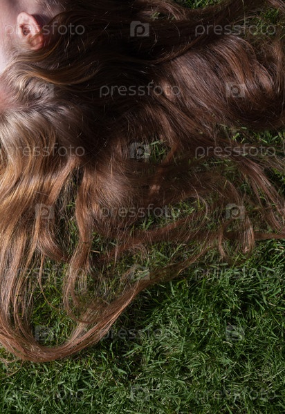 Красивая молодая девушка лежит на зеленой траве