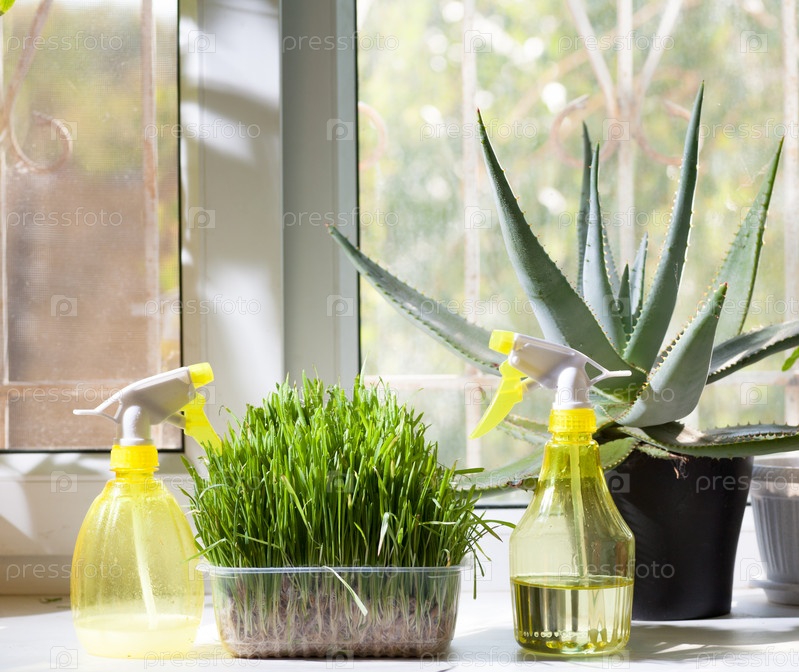 Два опрыскивателей и различные домашние растения в горшках на подоконнике