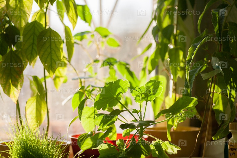 Горшечные растения на подоконнике в помещении