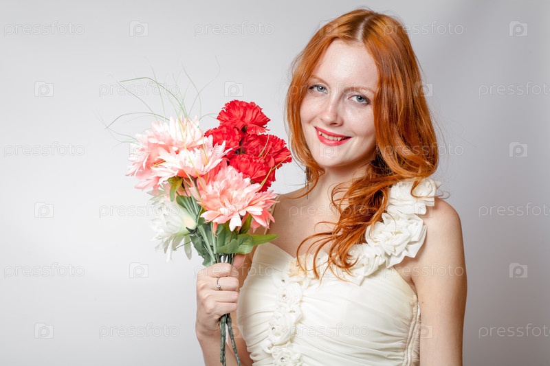 Красивая рыжеволосая девушка с цветами в студии