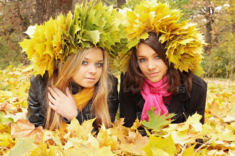 Молодые женщины в венках из осенних листьев
