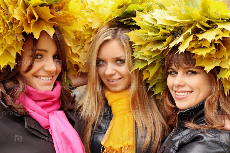 Счастливые женщины в венках из желтых листьев
