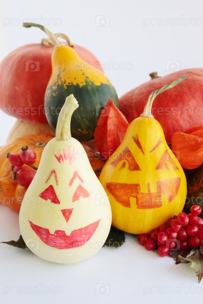 Натюрморт с разукрашенными на Хэллоуин тыквами на белом фоне