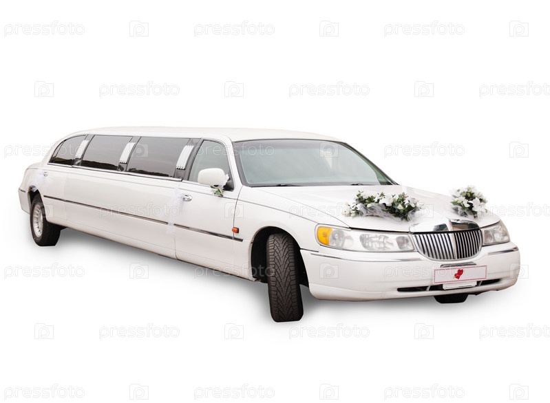 Белый свадебный лимузин, оформленный букетами, изолировано