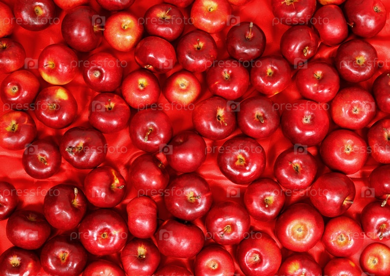 Красные яблоки на красной атласной ткани