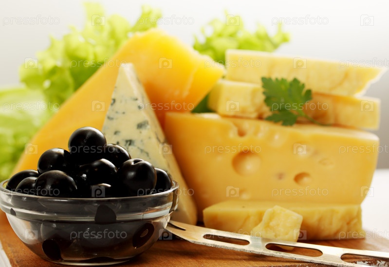 Натюрморт из различных видов сыров с оливками