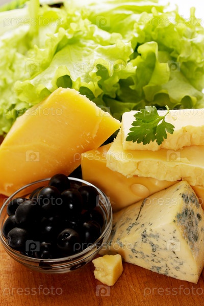 Натюрморт из различных видов сыров с оливками