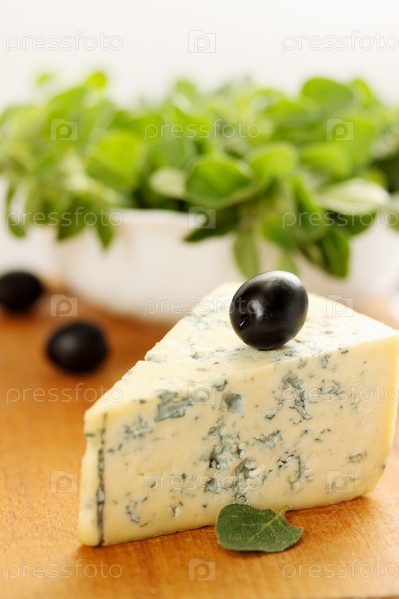 Большой кусок голубого сыра с маслинами
