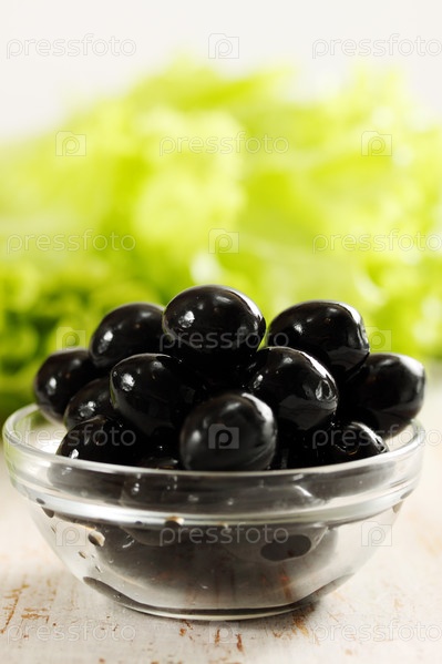 Черные оливки в тарелке и листья салата