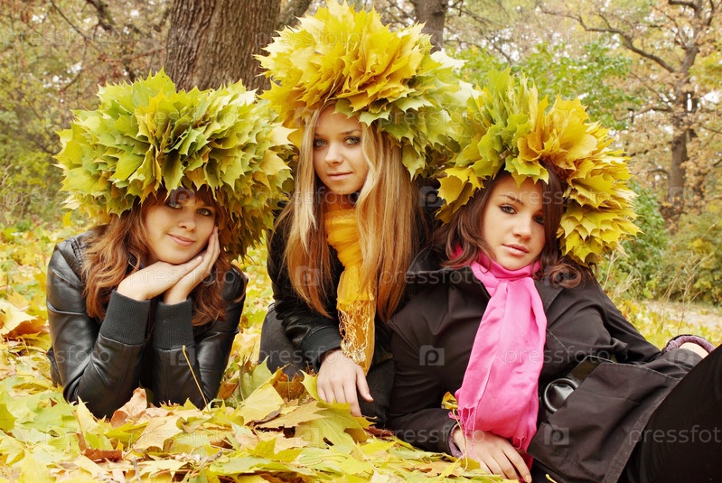 Молодые женщины в венках из осенних листьев