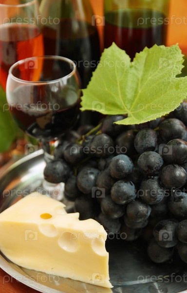 Натюрморт с бутылкой и бокалами вина и виноградом