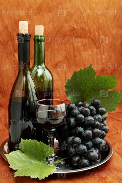 Натюрморт с бутылкой и бокалами вина и виноградом