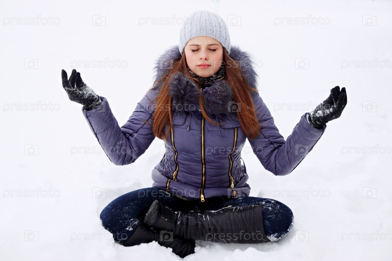 Девушка в позе лотоса в снегу