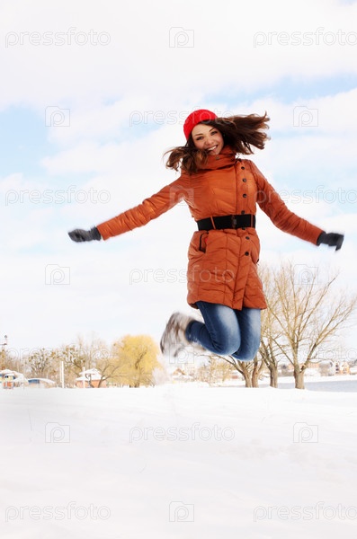 Женщина прыгает на свежем воздухе зимой