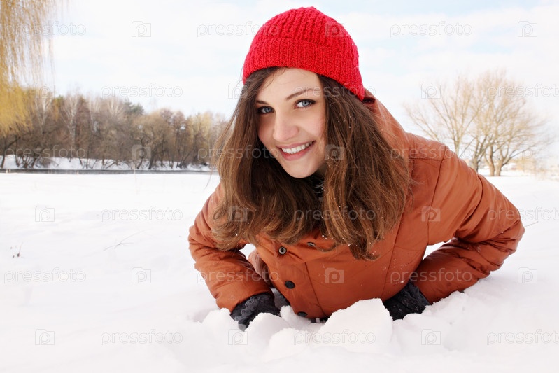 Красивая молодая женщина, лежащая на снегу