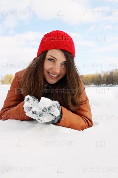 Красивая молодая женщина, лежащая на снегу
