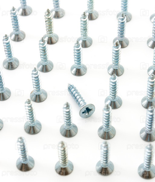 Некоторые винты на белом фоне. Эффект перспективы. В центре лежит один винт. Один был выделен из общего числа идентичных