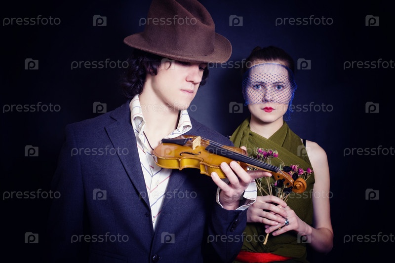 Молодой человек в шляпе со скрипкой и молодая женщина