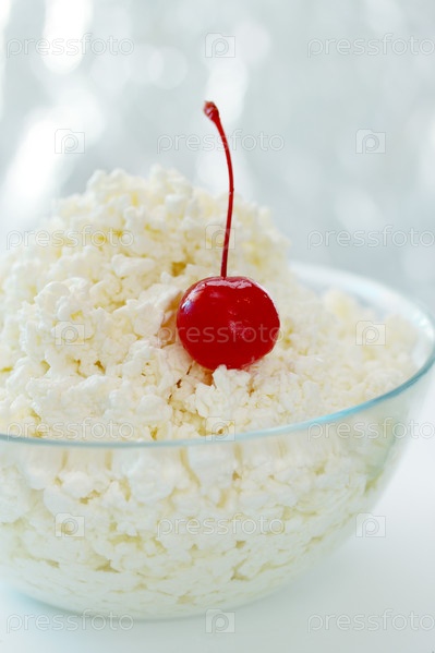 Творог с вишней в прозрачной тарелке