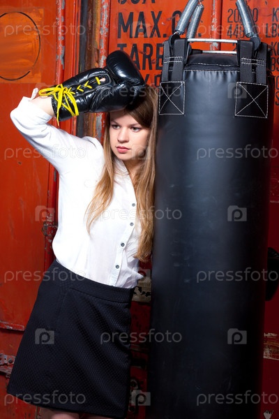 Девушка в деловой одежде возле боксерской груши