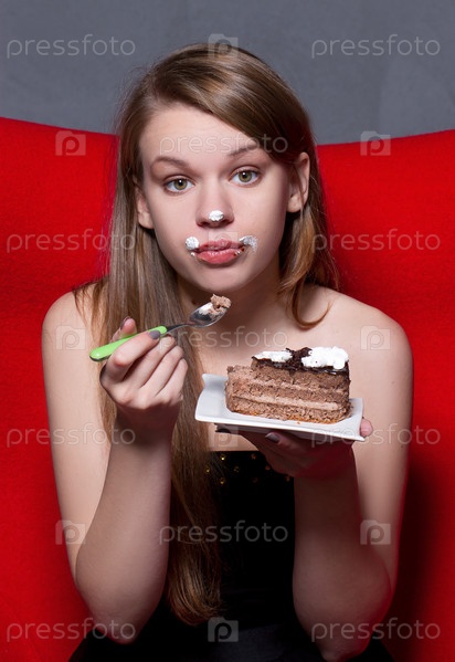 Девушка ест шоколадный торт