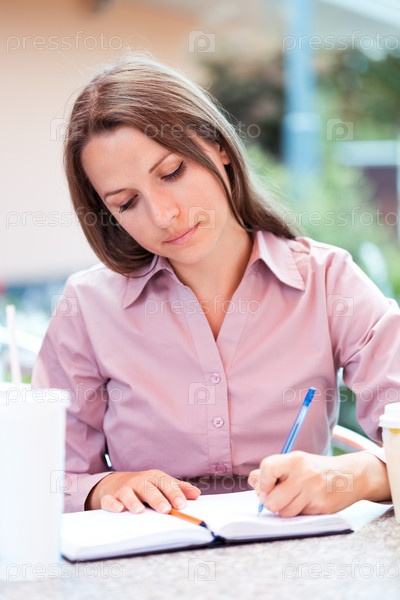 Деловая женщина сидит в кафе и пишет в блокноте
