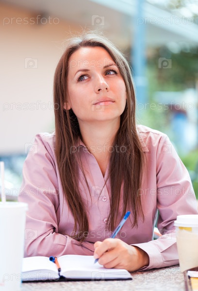 Деловая женщина сидит в кафе и пишет в блокноте