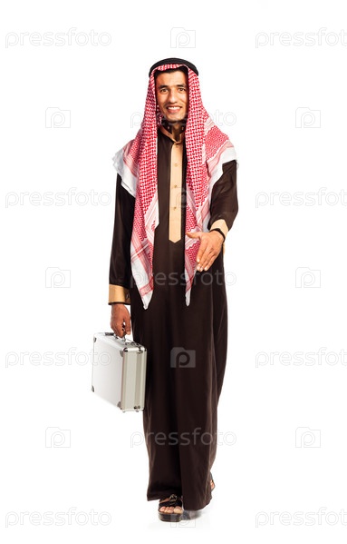 Молодой араб с алюминиевым чемоданом, изолированный на белом фоне