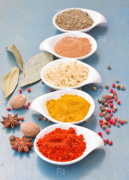 Тарелки с яркими специями на синем столе