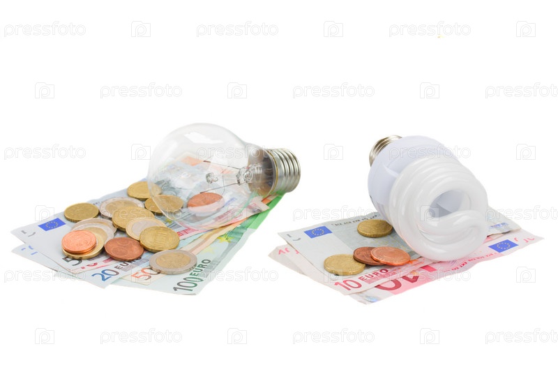 Экономичная и обычная лампочки на банкнотах евро
