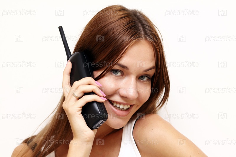 Молодая девушка, разговаривающая по телефону на белом фоне