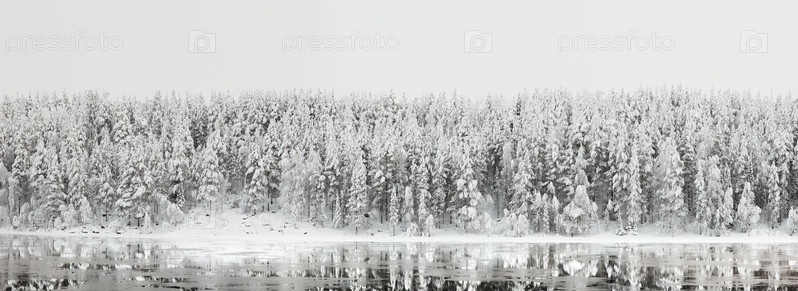 Панорама зимнего леса с отражением в реке