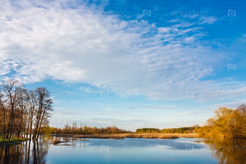 Небо и облака отражаются в озере