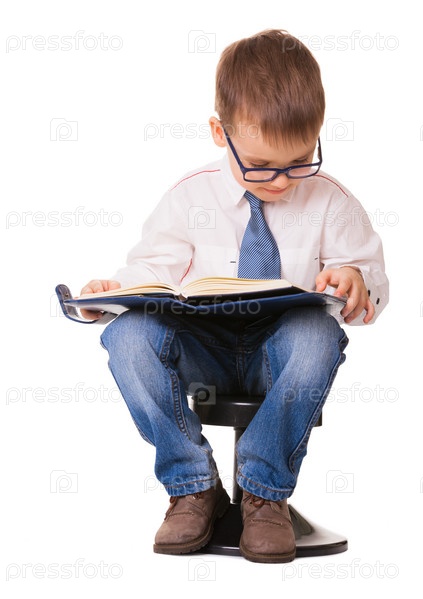 Милый мальчик в очках читает блокнот