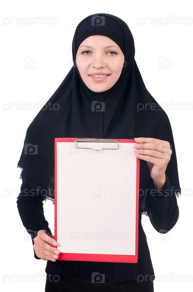 Мусульманская женщина с пустой доской на белом фоне