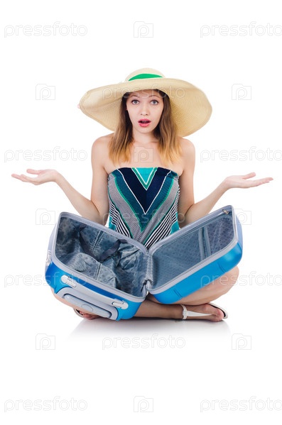 Женщина с чемоданами на белом фоне