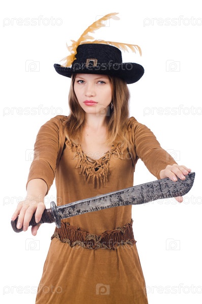 Женщина в костюме пирата с ножом, изолированная на белом фоне